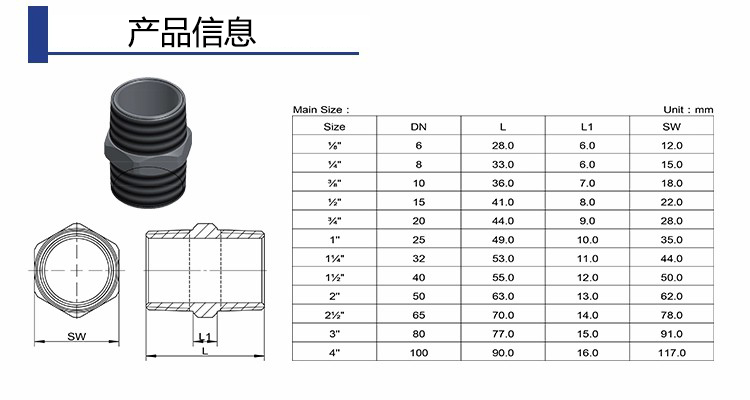 | 不鏽鋼六角(jiao)外絲接頭 | |